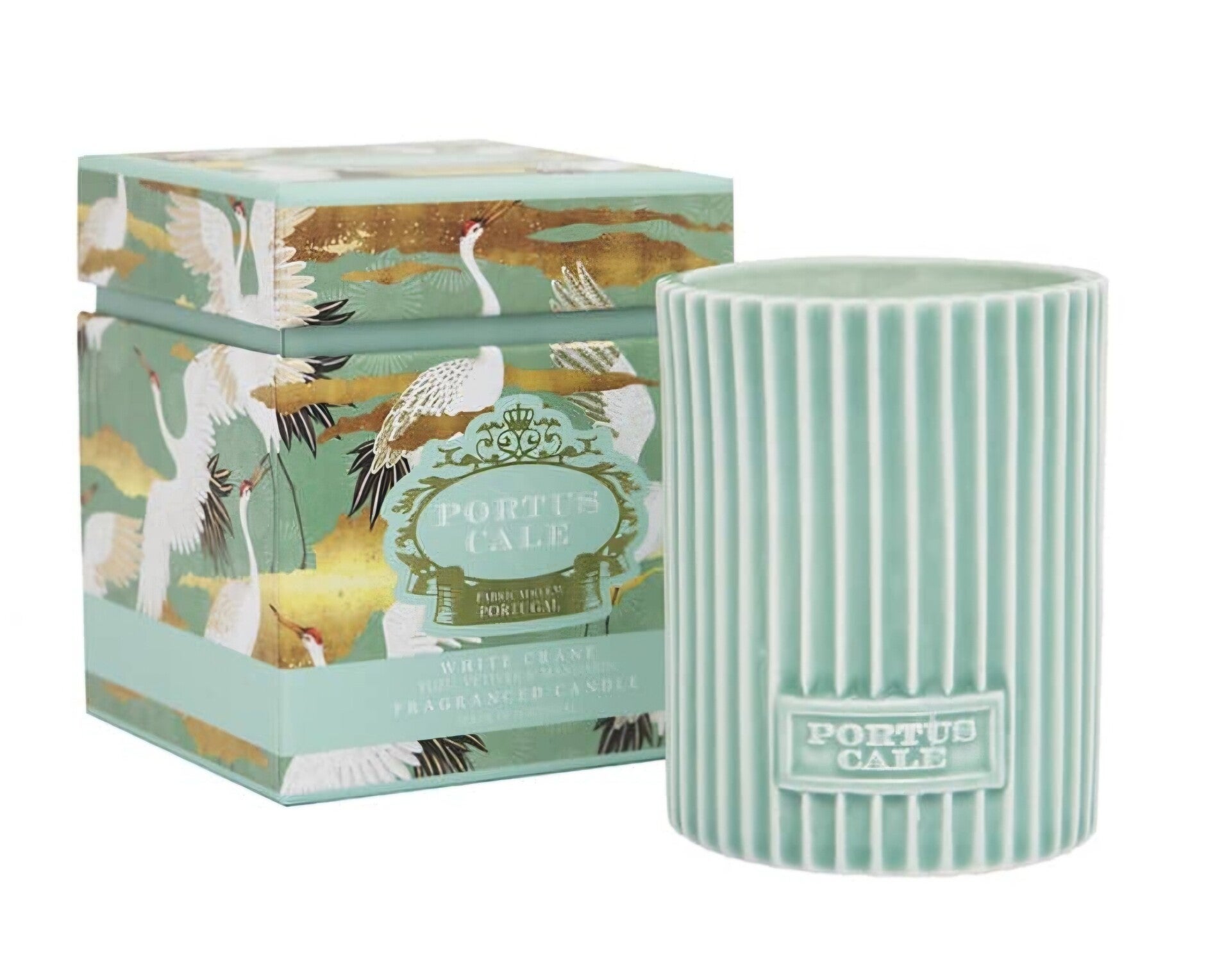 La bougie aromatique White Crane possède une tasse en céramique vert aqua, décorée d'un gracieux effet cannelé, qui transmet la sensation relaxante d'une promenade dans une forêt de bambous.